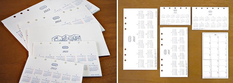 全体がは10 面(片面)、9折りになっています。全体カレンダーが 2 ページあり、残りの片面 9 面に3週ずつを配置(片面 27 週)、54 週を両面で表現しています。(フィールドサイズのみ、11 面 10 折り)となります。