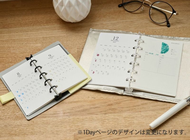 2026年カレンダー12ヶ月分と、月の満ち欠けや願いごとを書き込める1dayページ28日分がセットになっています。(1dayページのデザインは変更になります。)