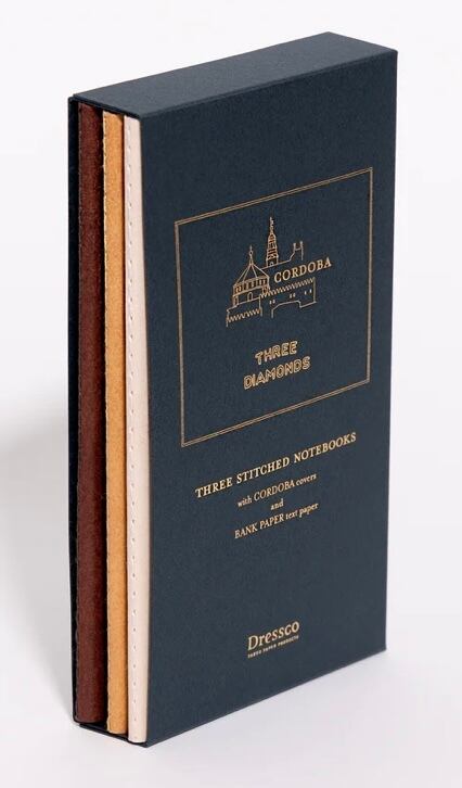 ミシン製本でつくられた、携帯に便利な手のひらサイズのノート3冊セット。箔押しで装飾を施したケースに入っています。本文はペン走りが滑らかで、緻密で張りのある平滑なステーショナリー用紙、バンクペーパー。この紙は裏抜けに強く万年筆にも向いています。「THREE DIAMONDS」の透かし模様入り。表紙は革のような独特のぬめり感としなやかさを追求した紙、コルドバ。ベラム、ビスター、マルーンの全3色です。ギフトにもおすすめです。